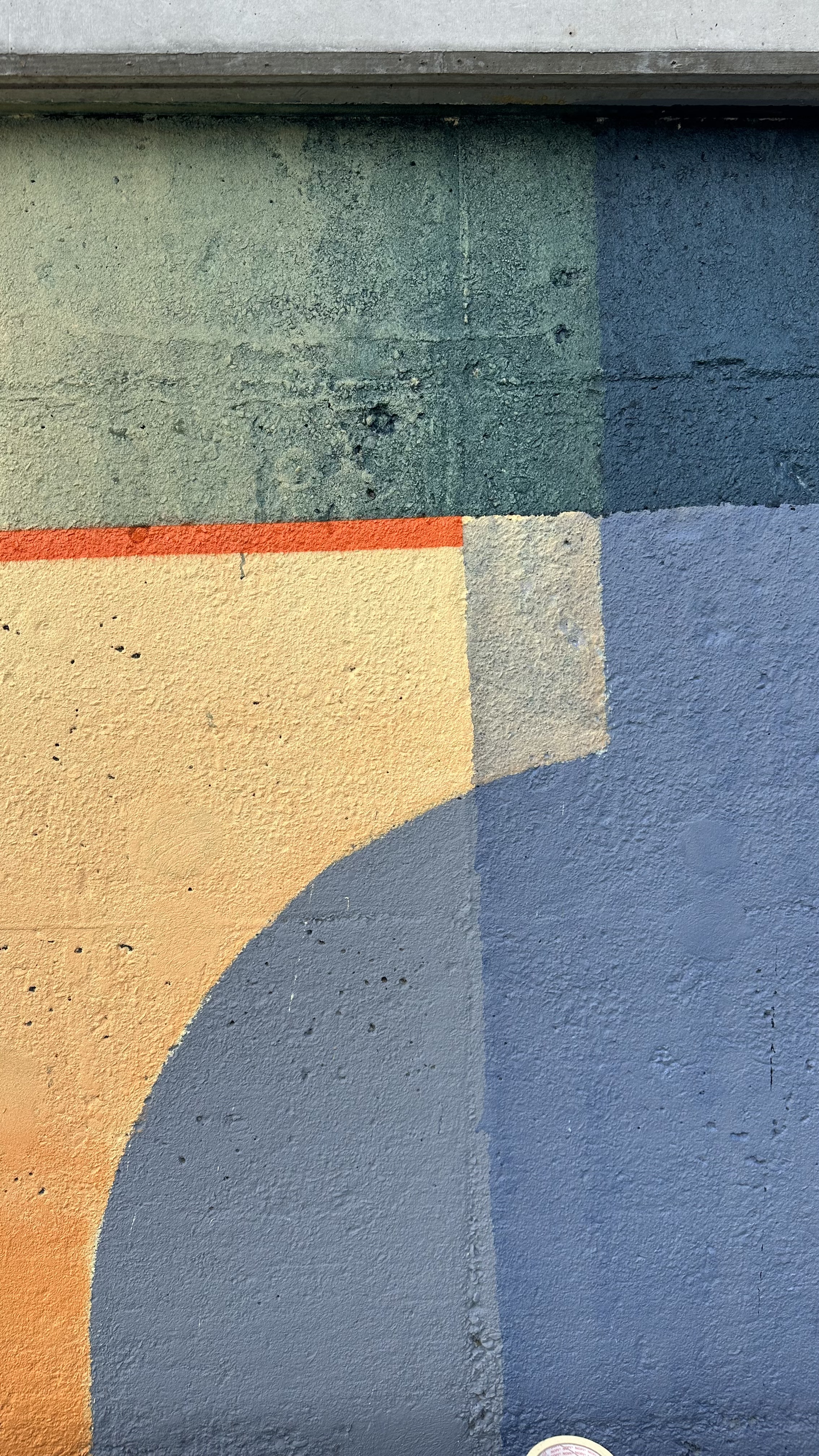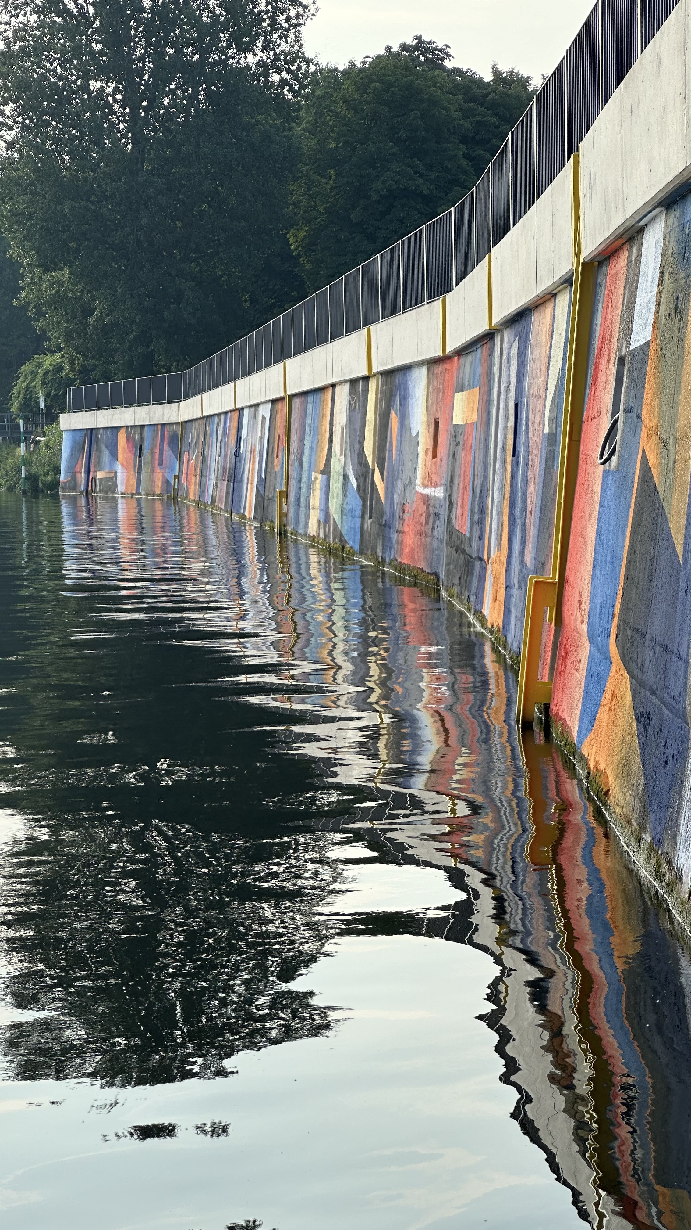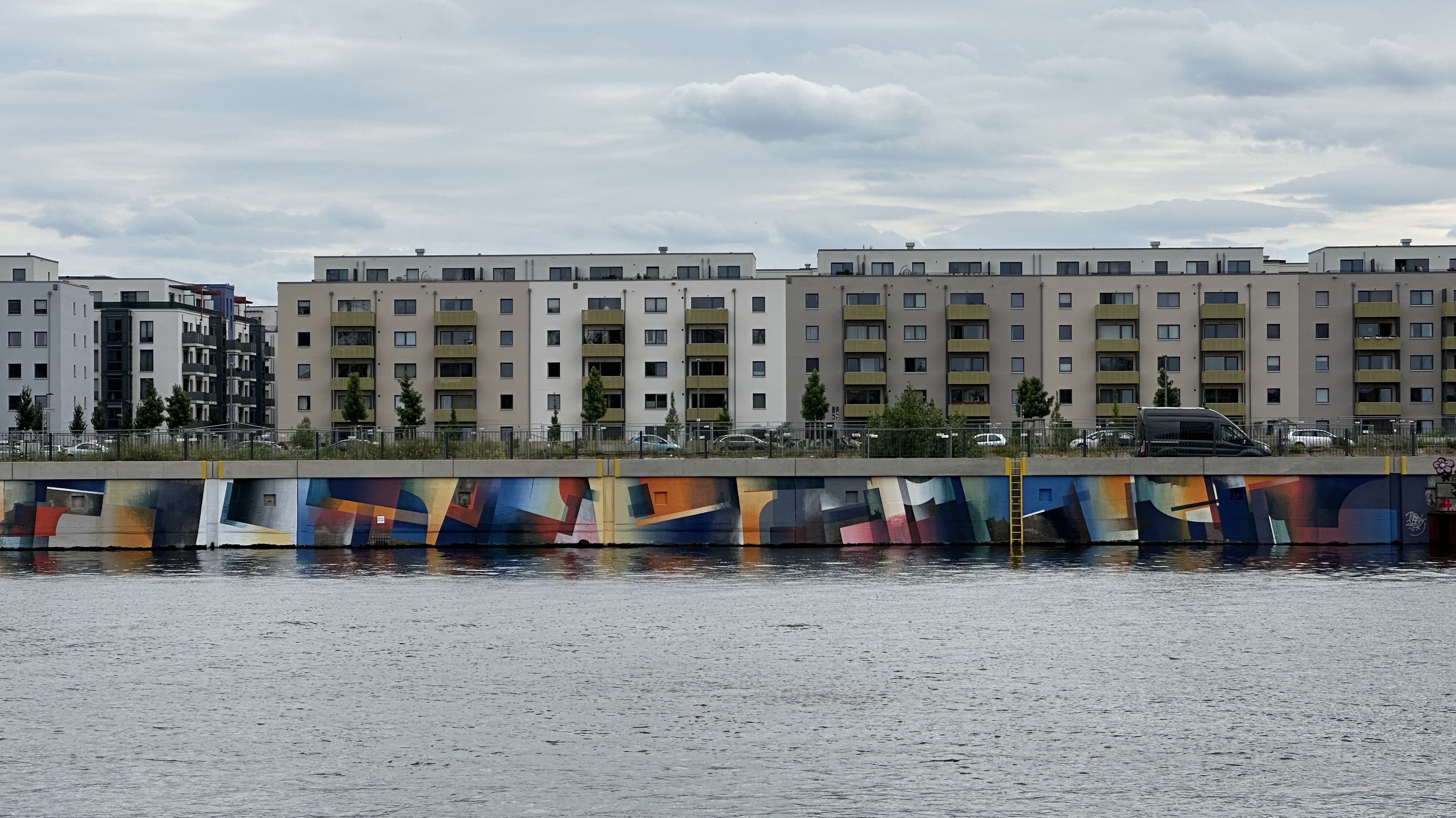 In Berlin‘s Treptow-Köpenick district, the embankment wall has been reflecting vivid colours across the Spree since summer of 2024. While the BUWOG WOHNWERK development behind it is still partly under construction (approximately 900 rental apartments and condominiums will be built in several stages by 2027), the artist is creating awareness for the new residential development. Known for his colourful in situ installations, façade designs and abstract murals that border on urban art in their dynamism, and in the tradition of mid-century abstract painting, Tomislav Topic focuses on colour and form as the primary content of his work. Fluxa Stratis (Latin for layers of flow) features silhouette-like overlaps and interlaced colour surfaces, whose starting point is in the complementary contrast of blue and the orange in BUWOG’s logo. The mural blends harmoniously into the architecture, quotes the changing moods of light and weather in its design and, as a changing reflection in the water, is becoming a defining landmark in the public space. For 11 days, the artist worked on the wall from a raft – pulled by a barge loaded with 250 litres of paint, which functioned as a floating studio. To complement the work, the artist produced a time-lapse video from his studio in the former Schöneweide industrial site on the opposite bank of the Spree, documenting the process of creating the immense mural.