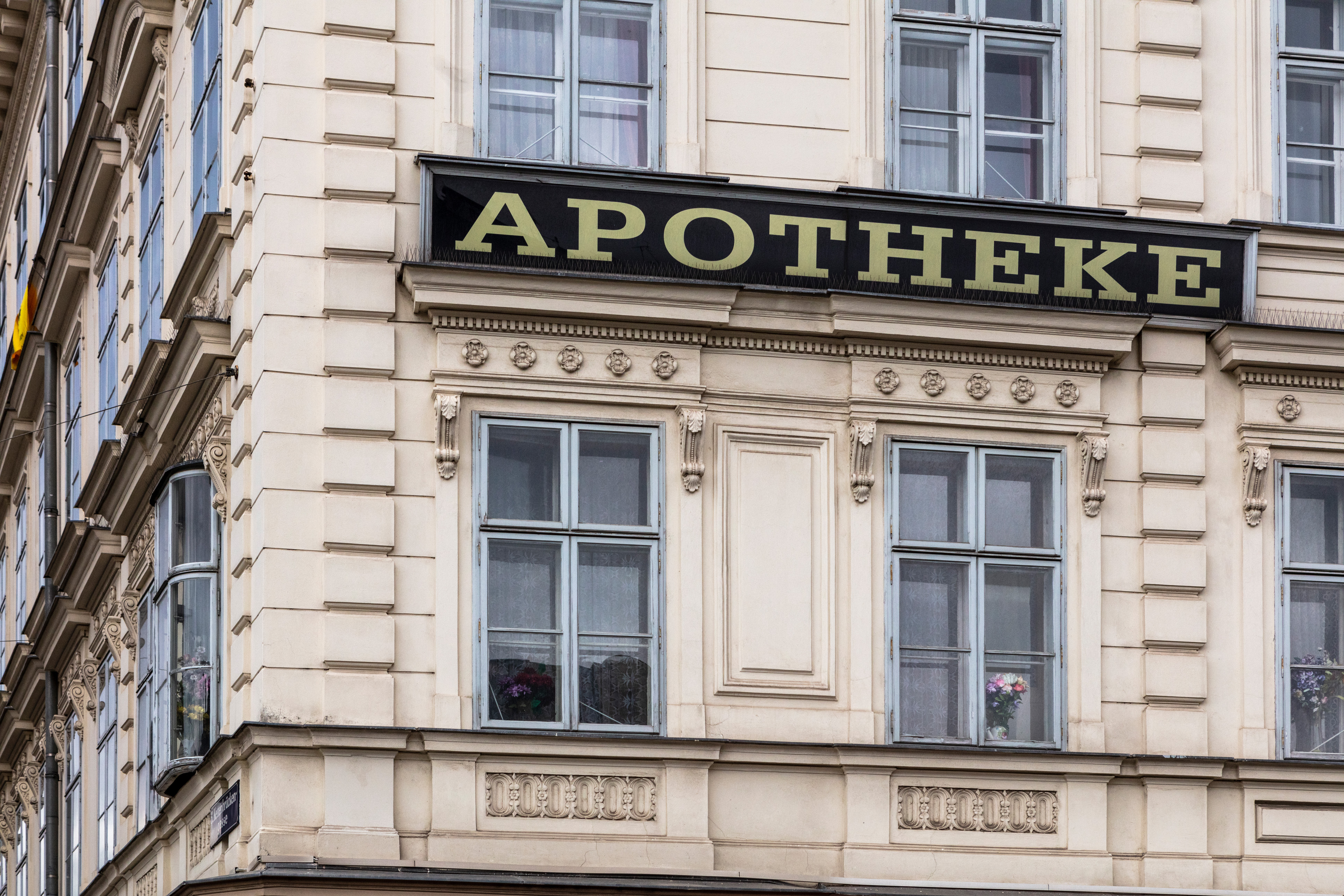 The Biedermeier building with an early historic façade comprises four wings around a square courtyard featuring a fountain. Four storeys above a sandstone base, a richly structured façade, Gothic ornamentation and a clock in the central gable characterise the exterior. As the cornerstone of Kettenbrückengasse, which was only established in 1827, the exemplary Vormärz architecture (including the historic bakeries in the cellar vaults) was listed as an historical monument in 1974. The building, which has housed a pharmacy since 1869, was refurbished and revitalised by BUWOG.