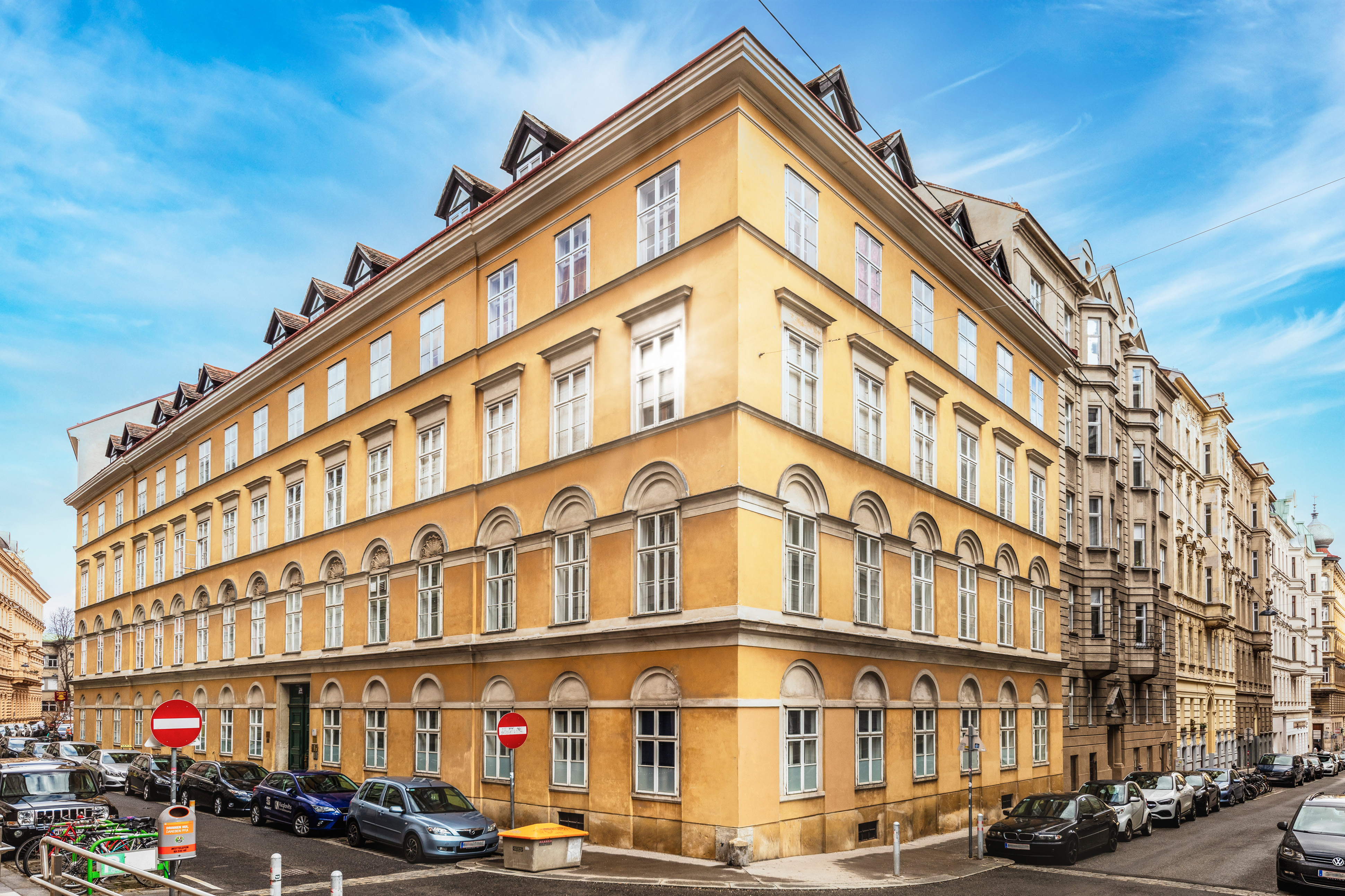 Anton Hoppe was known as the master builder of the architects Joseph Kornhäusel and Carl Roesner and was responsible for the designs of the Mechitarist Monastery and the Church of the Redeemer as well as numerous town houses in the rapidly expanding Viennese suburbs. Built in 1829 for Franz Hirsch, the residential building at Wasagasse 26/corner of Thurngasse 9 has a modern grid, streetside façade featuring round arches (lunettes adorned with shells) and a stag as a house emblem and reference to the owner’s name. On the courtyard side, the seasons are set into the brickwork as relief medallions. BUWOG has completely refurbished the four-storey apartment building and adapted it for modern residential use.