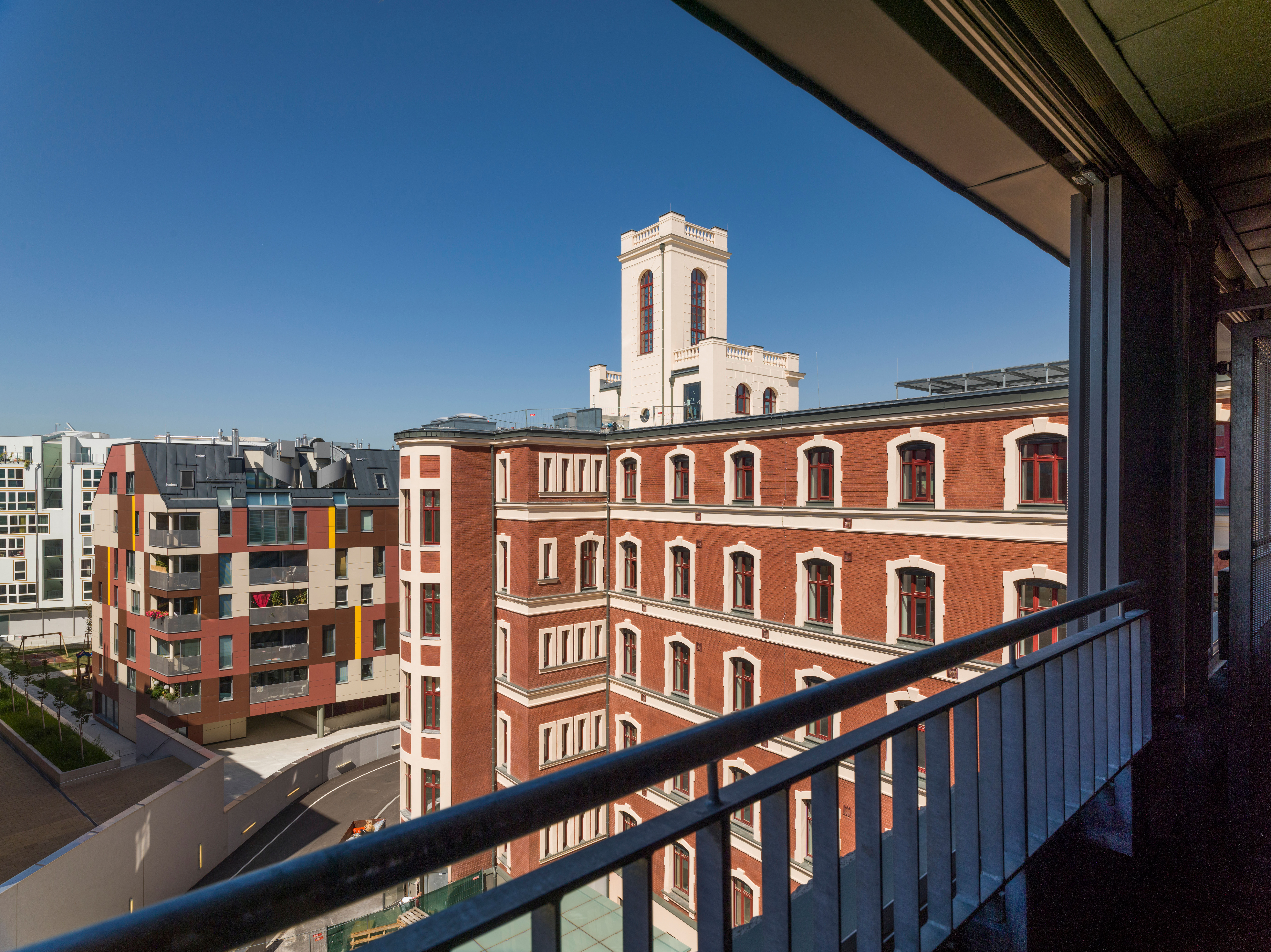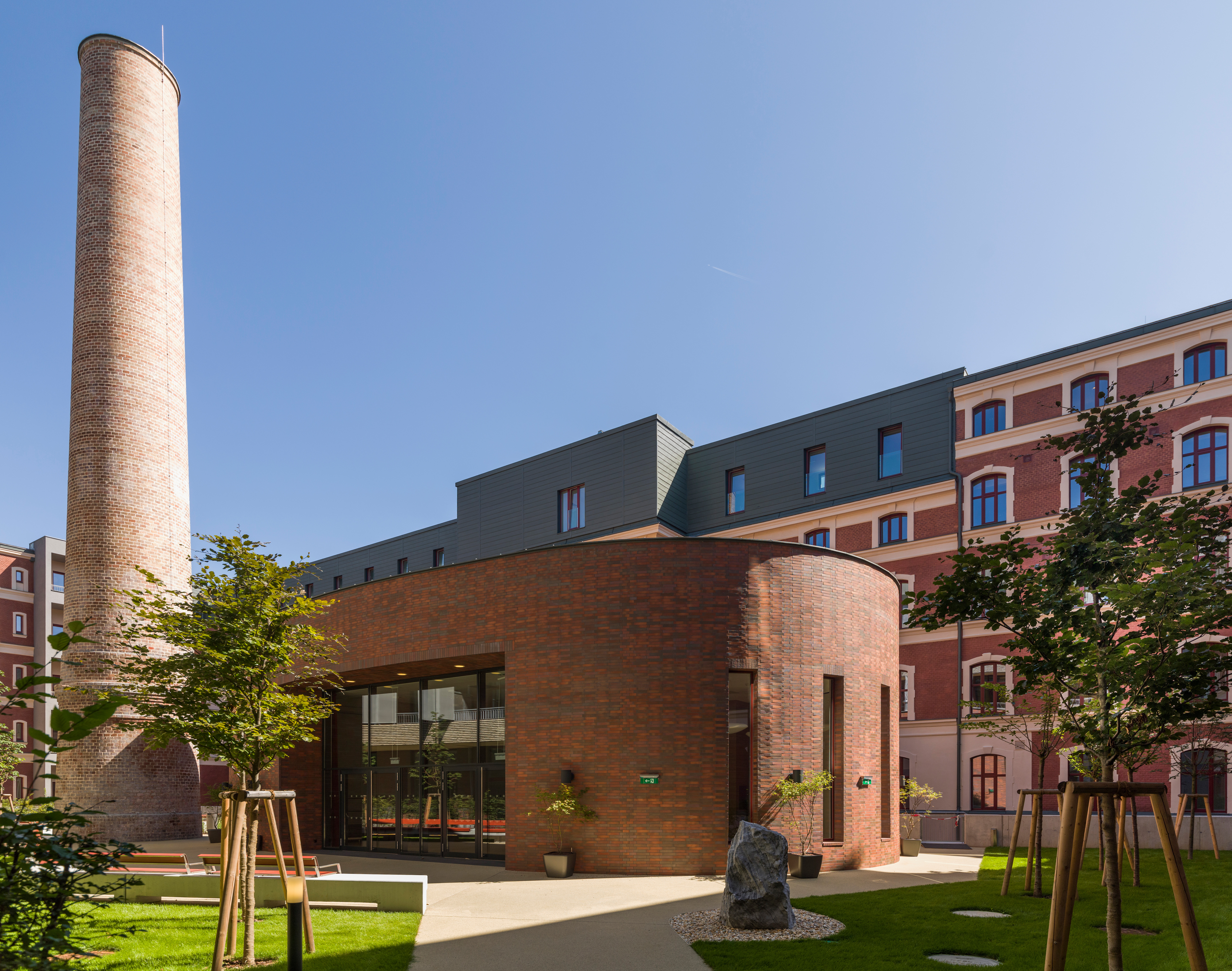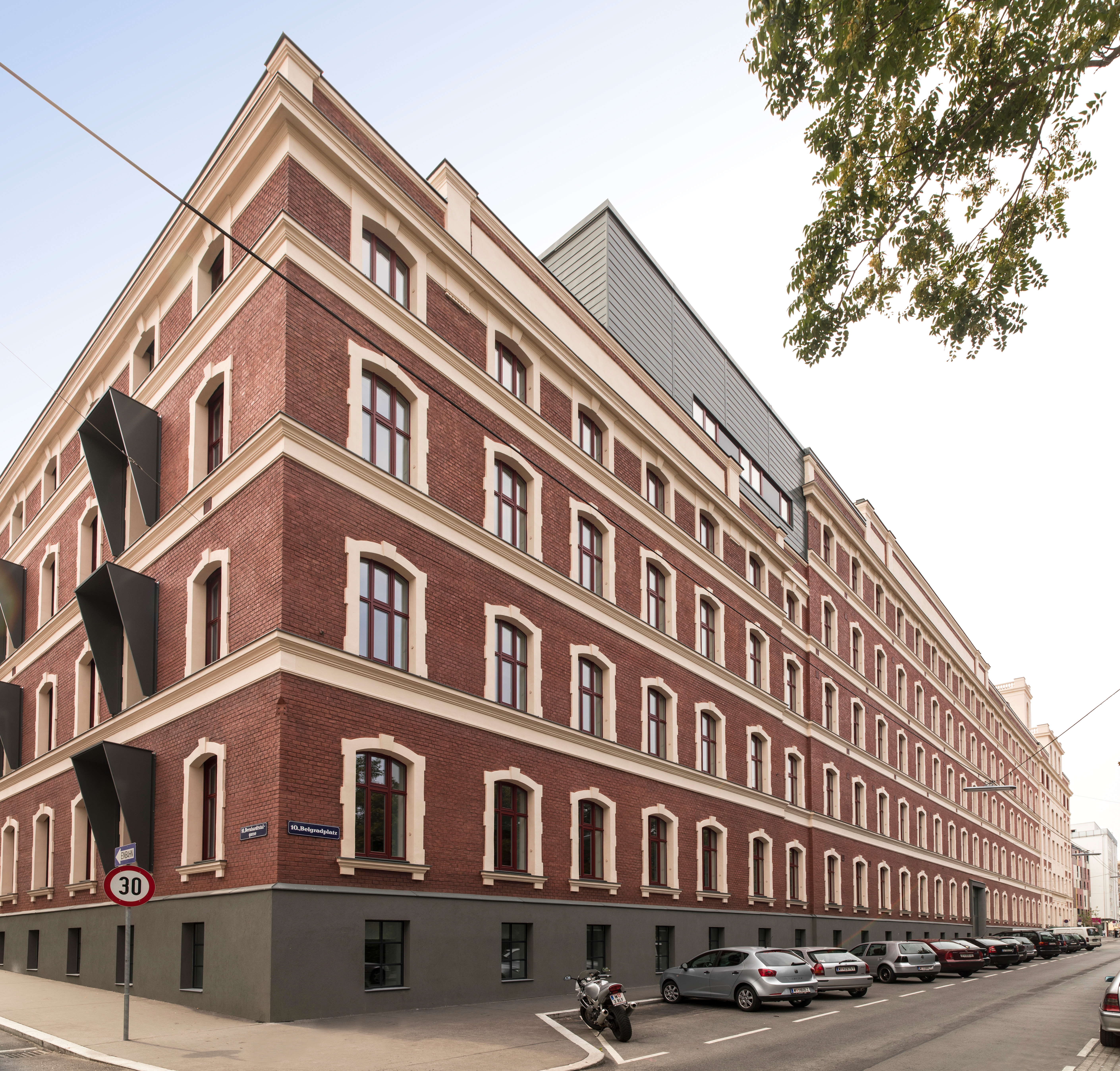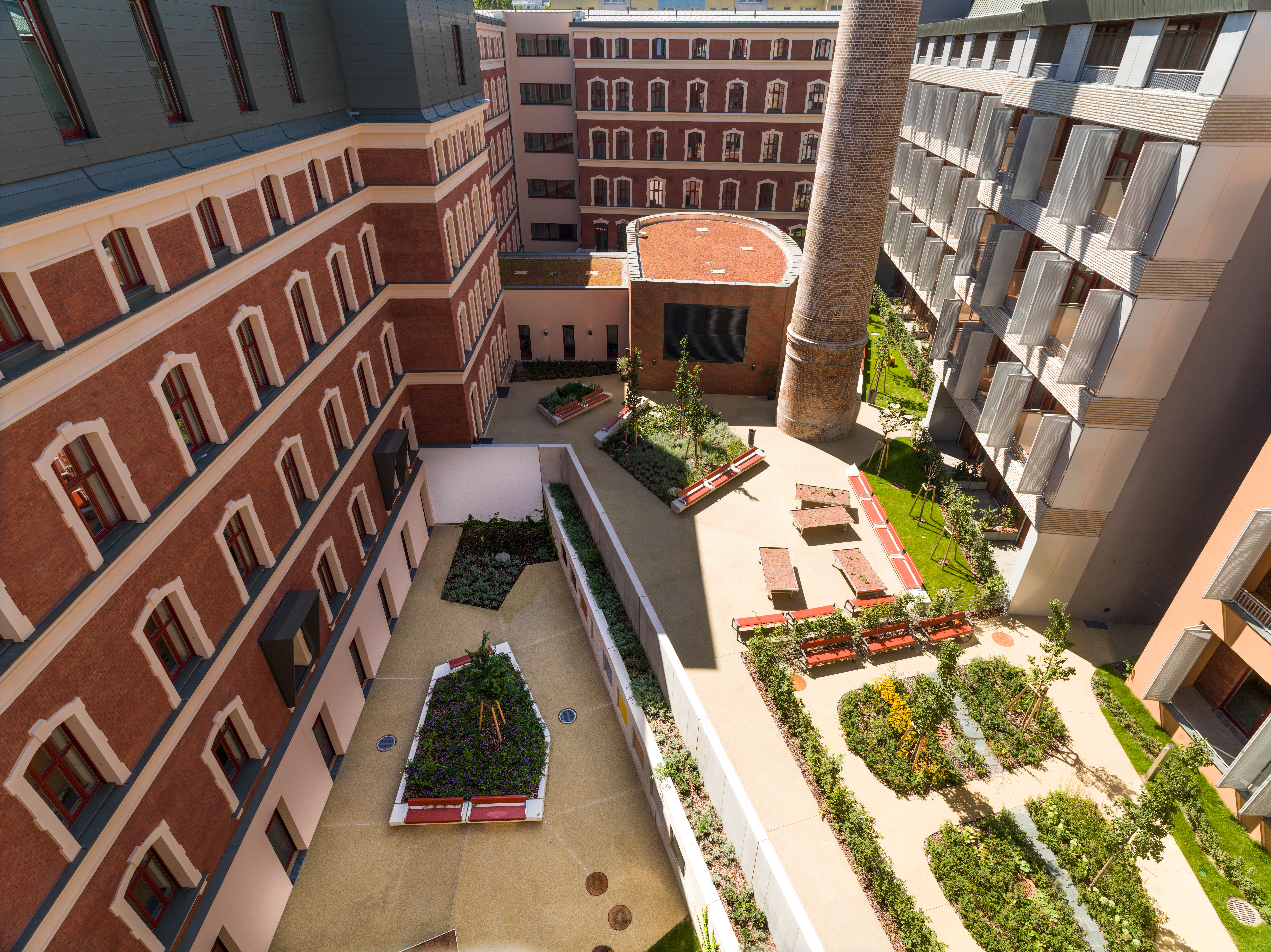 Founded in 1890, Gustav and Wilhelm Heller’s sugar factory already needed a larger site in 1898. The massive, exposed brick building with an additional structure (boiler house with chimney in the central courtyard) was expanded several times by Siegmund Müller between 1910 and 1914. Until the First World War, Heller, a purveyor to the Imperial and Royal Court, also maintained operations in London, Paris and New York and employed 1,500 people in Vienna. After Aryanisation and restitution, the company was sold in 1970, with publishing houses and artists’ studios temporarily moving into the historic industrial monument. Beginning in 2009, the extensive site was developed for modern use with five residential cubes, a geriatric centre, office and commercial space as well as expansive green areas.