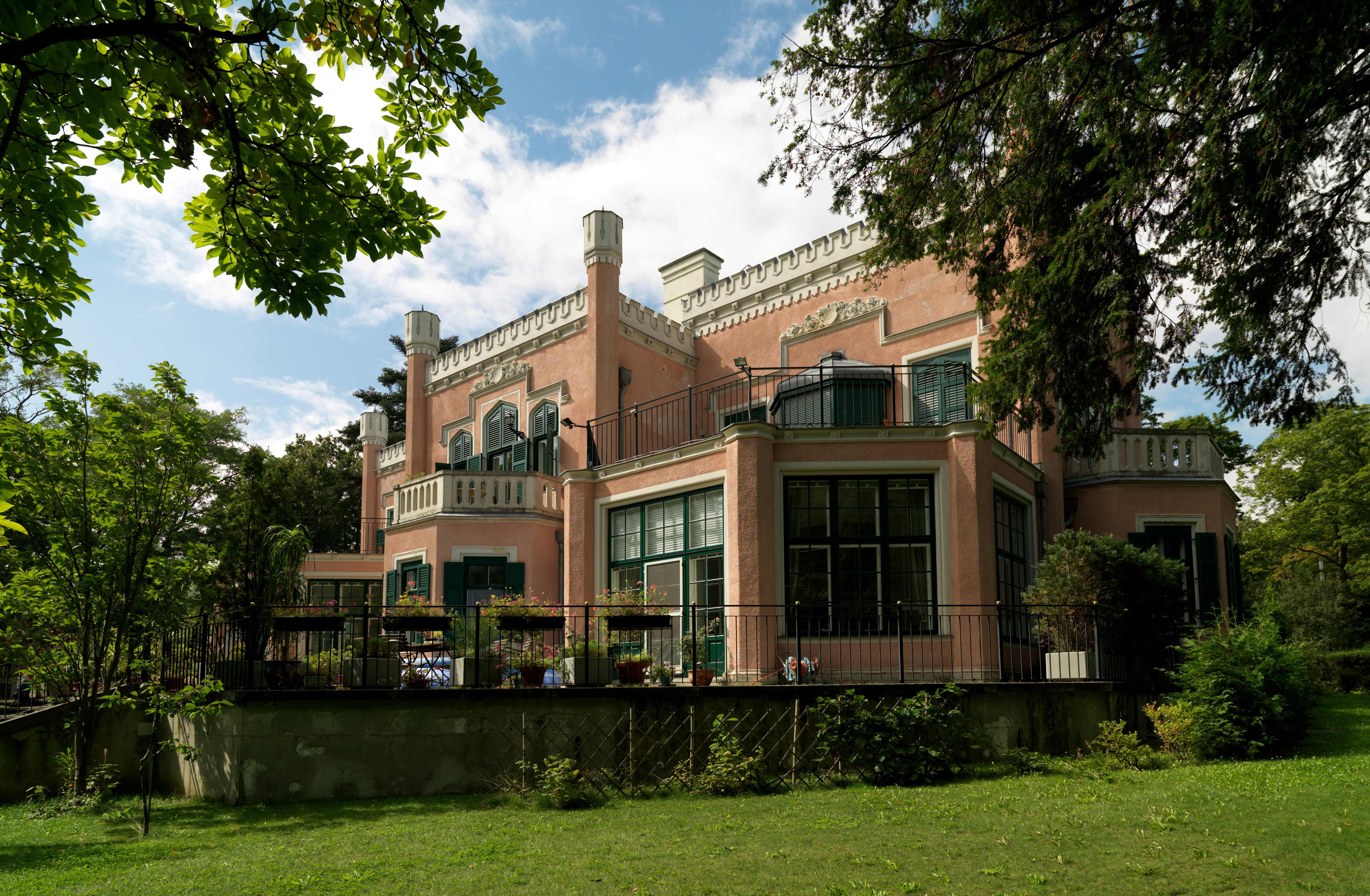The architect is not documented, but due to the quality of the Körnerschlössl, he is presumed to be one of the famous Ringstrasse architects with whom the banker, patron of the arts and builder Moritz Todesco was likely acquainted. As a country residence outside the city, the pink villa with towers, projecting risalits and crowning battlements references the English Tudor Gothic style in the fashion of the time, a style that was popular in the Romantic Historicism used for barracks, railway stations, palaces and country houses but was rarely preserved in other residential buildings.